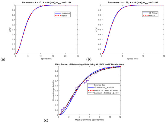 In the paper by Lorenz [20], data collected on Martian wind speeds was analysed from the Viking 1 and 2 landers. It was shown that the Weibull distribution is very accurate in describing the variation of wind on the surface of Mars. Figure 9b shows the performance of the 1D-Weibull and Weibull for data collected by the Viking 1 lander during the first 0–100 sols. Similar analysis has also been done to other data collected at different sol periods to confirm typical performance as shown in Figure 9b but have been excluded for brevity reasons. The results of Figure 9a,b confirm the divergence relation between the 1D-Weibull and Weibull because for the parameters in the figures that describe real wind speed data, the convergence between the 1D-Weibull and Weibull is zero or very close to zero as Figure 4a shows. Using data obtained from the Australian Bureau of Meteorology (BoM) [21], Figure 9c shows fits to the mean daily wind speed in km/h by the 1D-Weibull and Weibull distributions. As a comparison, the Gamma-distribution is also shown with corresponding estimated parameters from the data set. Given that the data is the mean daily wind speed, the fitted data is susceptible to outliers which have a dramatic effect on the fits of all the distributions.