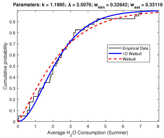 In [22], data was analysed which was concerned with the rate of water consumption during summer. For further details, the reader can refer to the paper [22]. Figure 10 shows the fit to the summer data by the 1D-Weibull and Weibull distributions. Even though the 1D-Weibull is a one parameter distribution, it performs really well compared to the two-parameter Weibull. Observe that for the 1D-Weibull, both the estimated w from the data and the predicted version from the Weibull parameters (43), are approximately equal as discussed previously.