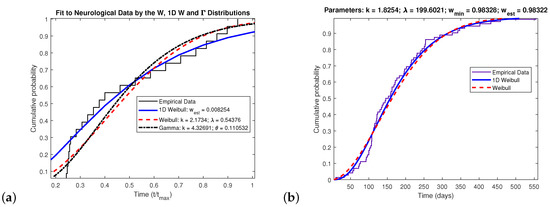 CDFs of the 1D-Weibull and Weibull for (a) neurological data pertaining to memory retention as a function of time (dimensionless) and (b) the survival duration data of guinea pigs infected with the tubercle bacilli virus.