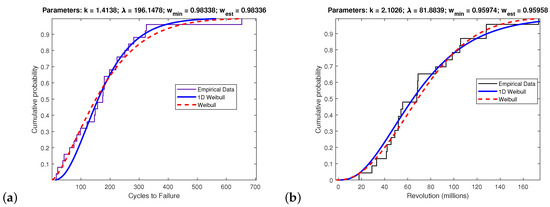 Modelling processes that have a given lifetime is a subject area of great interest in many areas of science and engineering. This is especially true in the manufacturing industry where products are tested rigorously to ascertain how many cycles or time is required before they fail. Two such data sets are fitted here using the 1D-Weibull and Weibull distributions [26,27]. In the first data set, twenty five 100 cm specimens of yarn are tested at a given strain level. The data considers the number of cycles before failure (breakage). Figure 12a shows the empirical CDF against the 1D-Weibull and Weibull distributions. The other data set [26,27] investigates the endurance of deep groove ball bearings. Lifetime tests are conducted for twenty three ball bearings and the number of revolutions (in millions) before failure is represented in the data set. This data is fitted by the 1D-Weibull and Weibull distributions and is shown in Figure 12b. Once again, in both Figure 12a,b, the predicted and estimated values of the parameter w are approximately equal in each case.