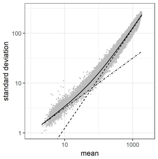 In order to incorporate Taylor’s fluctuation scaling term Equation (6) as the standard deviation of Equation (7), we approximate the Poisson distribution by the Normal distribution in the case that is statistically large (i.e., ). The Normal distribution for and is very similar to the Poisson distribution for , and for , the distributions are virtually indistinguishable []. We apply the approximation by the normal distribution for since the skewness of the Poisson distribution of is smaller than that of , hence, closer to 0, which is the value of skewness of the normal distribution, whereas the ratio of change of the standard deviation by Taylor’s fluctuation scaling at is below , where .