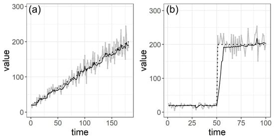 Estimation results of two types of artificial non-stationary time series using the particle filter without discontinuous detection shown in Section 2.4. (a) Continuous rise time series from to 200. (b) Step-like time series from to 200. Gray line: artificial time series, Black dotted line: assumed values of , Black solid line: estimated values of .