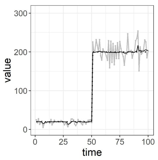 Figure 2b indicates a step-like time series which increases from to 200 in gray line. The estimated values of in black line generally follows the abrupt step-like change of the assumed values of , but there exists some delay. The assumed values of changes 20 to 200 at time 50, but the estimated values of reaches to 200 at about time 80. The by Equation (12) is .