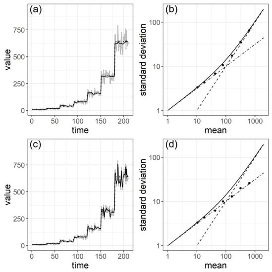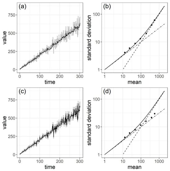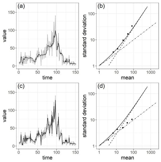 The result is shown in Figure 4b. The plots are along the relationship of Taylor’s fluctuation scaling illustrated in black solid line. This ensures the validity of our model for Taylor’s fluctuation scaling. The RMSE between the theoretical standard deviation () by Equation (6) and the estimated standard deviation (), standardized by at each time as shown in Equation (13), is .