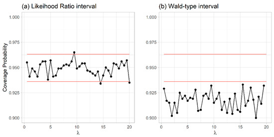 Coverage probabilities for the (a) likelihood ratio confidence interval and (b) Wald-type confidence interval for exponential distribution with different intensities (λ). Vertical lines represent the tolerance limits for 1000 simulation and 95% nominal coverage probability.