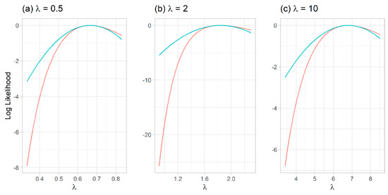 Order statistics likelihood (blue line) and quadratic approximation (red line) for an exponential random variable with intensity (a) 0.5; (b) 0.2; and (c) 10.