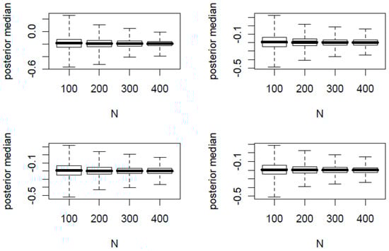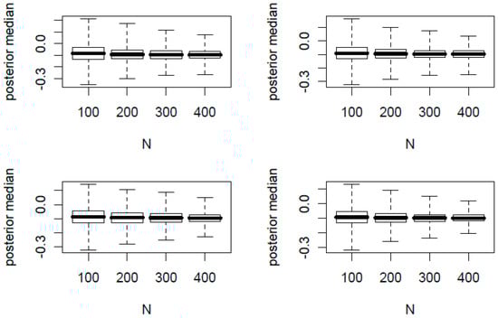 - For each panel of four boxplots, the variation of the posterior medians decreases as N increases.