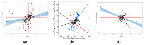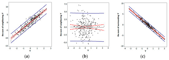 Specimen Moran scatterplots portraying different natures and degrees of spatial autocorrelation (n = 254) using z-score axes; blue denotes 95% prediction intervals, red denotes 95% confidence intervals, and gray denotes trend lines; MCmax = 1.098 and MCmin = −0.635 denote the extreme Moran coefficient (MC) values. Left (a): Positive, MC/MCmax ≈ 0.7. Middle (b): Zero, MC ≈ 0. Right (c): MC/|MCmin| ≈ −0.7.