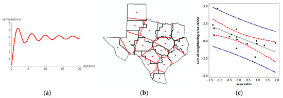 Examples involving NSA. Left (a): A wave-hole semi-variogram model plot. Middle (b): Texas environmental quality service regions with their superimposed Thiessen polygon counterparts. Right (c): A z-score axes Moran scatterplot for the polygon-to-region area ratio of Figure 4b; MC = −0.274.