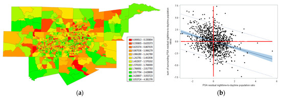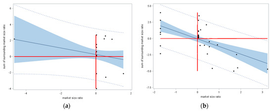 The Kohl’s department stores case furnishes proof of concept, demonstrating the feasibility of NSA emerging in a real world geographic landscape. Even with a single store closure (in a network of 27 stores), NSA (most spatial autocorrelation appears to be some type of PSA–NSA mixture, and hence, spatial autocorrelation mixtures essentially are present in many, if not most, georeferenced data; this notion is the topic of Section 3.2, Section 3.3 and Section 3.4 and their examples; only the NSA component of spatial autocorrelation is the focal point of the other examples discussed here, because presently a need exists to establish its presence) occurs [MC = −0.080 < −1/(27 − 1)]; however, although indicative of NSA (i.e., it is less than −0.04), this MC value was not statistically significant. Nevertheless, it did demonstrate in a non-trivial way that even a single closure induced NSA. Figure 7a portrays the Moran scatterplot for this case, which unmistakably has a negative sloping trend line. Based on the MC, the maximum NSA possible for the Figure 6a configuration of polygons was −0.525, which, stretching the endpoint of the MC scale to −1, suggested that −0.080 should be viewed more like a value of −0.152 (≈ −0.080/|−0.525|). Meanwhile, with eight of 47 stores closed in the Albertsons grocery stores case, NSA was very conspicuous [MC = −0.218, which was statistically significant (z = −2.2)]. Figure 7b portrays the Moran scatterplot for this case, which clearly had a negative sloping trend line. Based on the MC, the maximum NSA possible for the Figure 6b configuration of polygons was −0.525, which, again stretching the endpoint of the MC scale to −1, suggested that −0.218 should be viewed more like a value of −0.415 (≈ −0.218/|−0.525|).