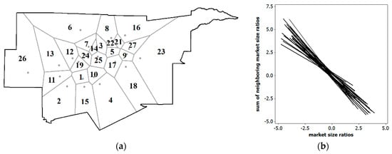 The aforementioned Texas area competition example furnishes a situation in which NSA measured by the MC can be used to index compactness. The market area examples presented in this section furnish a situation in which NSA as measured by the MC in leave-one-out (e.g., a jackknifing or cross-validation style of the procedure) hypothetical store closings can be used to index impacts of store closures. In other words, calculating the MC for each store’s market area set to zero, in turn, yields an MC as an index that can be related to other store attributes. Figure 8a portrays the geographic distribution of the 26 Kohl’s stores that are currently open. Figure 8b portrays the corresponding 26 Moran scatterplot trend lines for the leave-one-out market size reallocations, and Table 2 reports their accompanying MC values.
