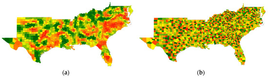 Many other forms of correlation exist in addition to the traditional linear bivariate Pearson product moment one describing associations, mostly between pairs of variables. Some are specific to particular measurement scales (e.g., nominal and ordinal); others are specific to studied themes. These latter include autocorrelation, which literally means self-correlation, and refers to correlation among observation values of a single variable, a fundamental topic of spatial statistics. Perhaps the most common autocorrelation investigated is for time series, and it is serial in structure. Another type, namely spatial autocorrelation (see reference [2]), is geographic in structure. The measurement value pairings of traditional linear correlation are by observation: A unit of analysis possesses two variable attributes. The measurement value pairings of spatial autocorrelation pertain to data organization and are juxtaposed locations: Two neighboring areal units possess correlated values for a single attribute. One difference here is that linear correlation is bivariate, whereas spatial autocorrelation is univariate. Paralleling the preceding description of linear correlation, for some variable Y, positive spatial autocorrelation (PSA) means that, relatively speaking, yH tends to neighbor yH, yM tends to neighbor yM, and yL tends to neighbor yL: Neighboring values are relatively similar (see Figure 1b; green counties tend to be neighbors, yellow counties tend to be neighbors, and red counties tend to be neighbors). Zero spatial autocorrelation means that yH tends to neighbor yH, yM, and yL, yM tends to neighbor yH, yM, and yL, and yL tends to neighbor yH, yM, and yL. Negative spatial autocorrelation (NSA) means that yH tends to neighbor yL, yM tends to neighbor yM, and yL tends to neighbor yH: Neighboring values are relatively dissimilar. A perusal of relevant textbooks and internet web pages reveals the presentation of very few real world NSA examples. This concept is one of the most—if not the most—neglected spatial statistics topics, and as such is the motivation for and theme of this article. Griffith [3] and Griffith and Arbia [4] furnish the initial conceptual and foundational discussions about NSA; this paper differs from their work by introducing new traits of NSA (e.g., its relation to jackknifing and model misspecification), beginning with an emphasis on special features of negative correlation in general. Therefore, the primary purpose of this paper is to furnish evidence supporting why statisticians should care about this mostly ignored concept.