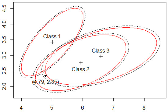 The acceptance sets are plotted in Figure 1 by the solid ellipsoidal regions. For example, if a future object has , marked by a solid dot in Figure 1, then the conservative confidence set of Liu et al. (2019) classifies the object as from Classes 2 and 3 since this belongs to both and . However, the new exact confidence set of this paper classifies the object as from Class 2 only since this belongs to but not or . This demonstrates the advantage of the new confidence set using in this paper over the conservative confidence set using by Liu et al. (2019). We have also computed the value of for several other given . For example, for , for , and for . The conservative is considerably, ranging from 14% to 19%, larger than these values.