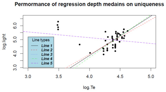 It turns out that there exist three maximum depth lines (medians) induced from RD R H . Each of the three lines goes through exactly two data points. In terms of (intercept, slope) form, they are (−6.065000, 2.500000), (−8.586500, 3.075000), and (−7.903043, 2.913043). These lines are plotted by dash red, dotted blue, and dotdash green in Figure 3. All three possess regression depth 21 / 47 . Note that the average of the three deepest lines is (−7.518181, 2.829348), which possesses RD 20 / 47 . That is, it no longer possesses the maximum regression depth.