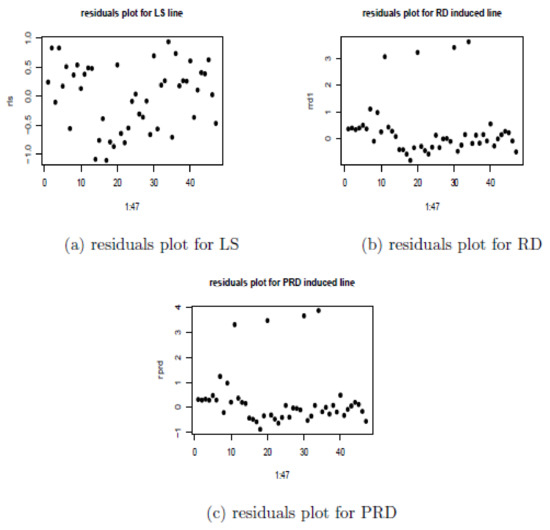 After obtaining ( β ^ 1 , β ^ 2 ) , one can immediately get the fitted line y ^ = β ^ 1 + β ^ 2 x (which has actually already been plotted in Figure 3), and the predicted values: y ^ i = β ^ 1 + β ^ 2 x i , and hence the residuals: r i : = y i y ^ i . All these involve the uniqueness issue, we first need to have a unique fitted line for each method. Here due to the non-uniqueness of the deepest RD lines, we select the first deepest line ( 6.065000 , 2.500000 ) among the three as a representative. Then we construct a table with nine columns: 1st is the id’s of observations, 2nd is the explanatory variable x i values, 3rd is dependent variable y i values, 4th–6th are the predicted y i ^ values for LS, RD, PRD methods, respectively, 7th–9th are the residuals r i for LS, RD, PRD methods, respectively (Table 1).