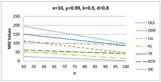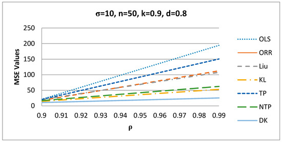 Figure 2 shows that as increases, the MSE values of the estimators decrease for σ = 10, ρ = 0.99, k = 0.9, and d = 0.8, and the proposed DK estimator has the smallest MSE value among all estimators.