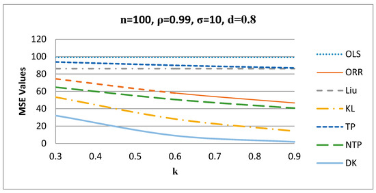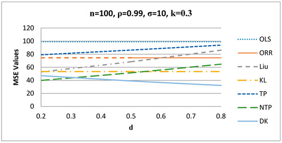 Figure 3 shows the behavior of , where as increases, the MSE values of the estimators increase for n = 100, ρ = 0.99, k = 0.9, d = 0.8, and for other values of these factors.