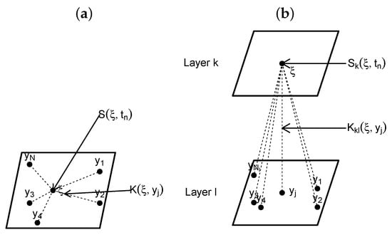 (1) We observe that depends on the knowledge of , which is not known in general. However, we observe that given in Equation (7) has minimum and a maximum of because has minimum 0 and maximum 1. This also means that although we may not know exactly the value of , we can estimate it to be between and . We can therefore select between and for and the estimate of the nontrivial solution will exist in a small interval of length (bandwidth) . Hence, if the domain Ω is very dense in points ’s, then the nontrivial solution will be a small perturbation of the initial external input, and, if the domain is sparse, then perturbation will be greater. Henceforth, for simplicity sake, we assume that . (2) Another observation is that S depends on the position of the neuron ξ in a single-layer system; however, in a multiple-layer system, it would be reasonable to think of S as depending on both the layer k and the position of the neuron on the layer, that is, .