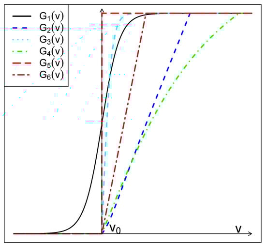 We note that Amari considered the dynamic of neural fields with pulse emission function G defined as the sigmoid function. However, the equation still has nontrivial stationary solution even if G is not the sigmoid. In fact, there is a large class of nonlinear functions G for which this is true (see Figure 2 and Table 1 below). For example, the following functions, often used in for training algorithm in artificial neural networks, have been adequately truncated for our purposes. Here, is a positive real number.