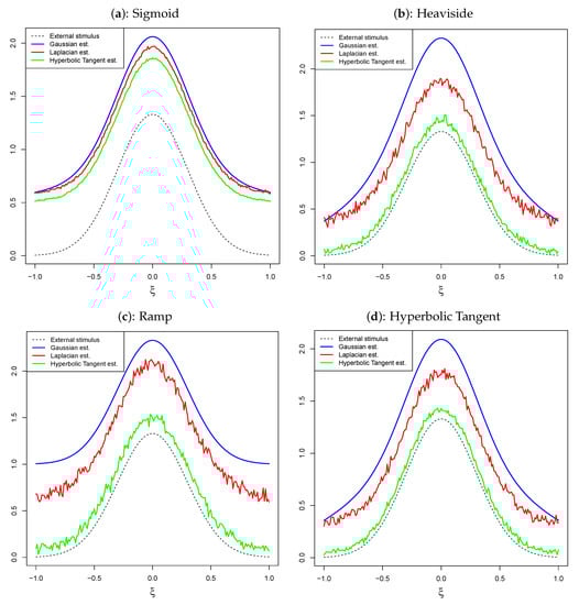 The curves are estimates of using the proposed estimator for different kernels, Gaussian (blue), Laplacian (red), and hyperbolic tangent (green) with a mean zero Gaussian external stimulus with standard deviation 0.03. Clearly, all kernels yield the expected pattern: (a) the sigmoid function ; (b) the Heaviside function ; (c) the Ramp function with ; and (d) the hyperbolic tangent inverse function .