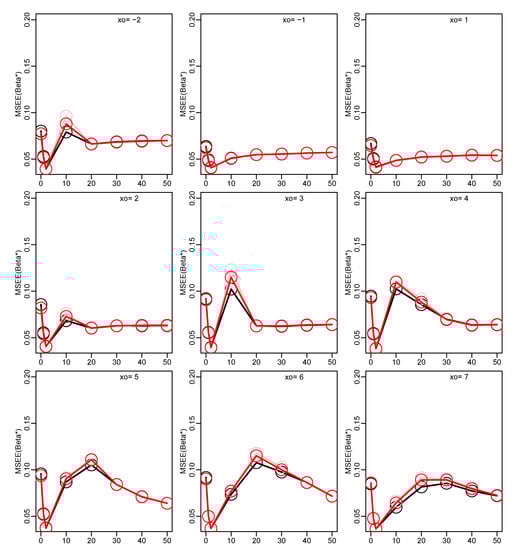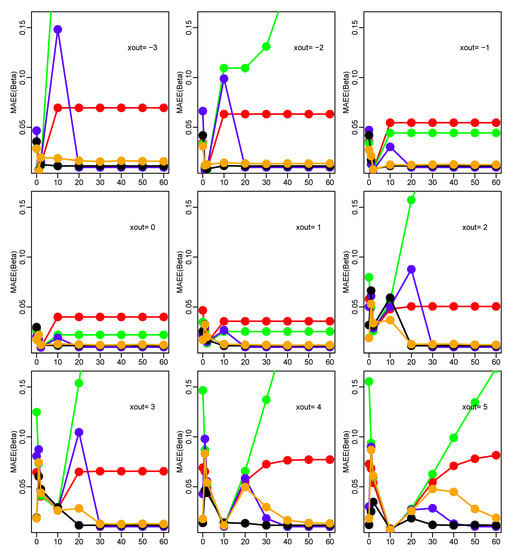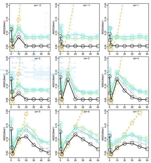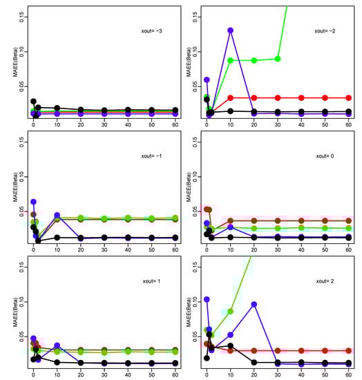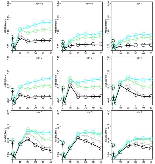 We first compared the four less efficient estimators: CUBIF11r, RQL01r, MTIr, and MD10r. The MSEEs of these estimators are displayed in Figure 1 as functions of . For , 6, the MSEEs of all estimators are very small because leverage points are removed and the graphs for are not shown. Important differences are observed for between and 2, and MD10r clearly provides the overall most robust behavior. For this reason, MD10r is considered as a good starting value for the MCML estimator MCML10.
