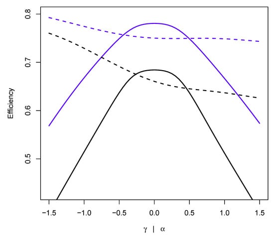 Efficiency of MD07 (blue) and MD10 (black) as a function of (solid) and of (broken): , , ; the solid line is obtained with and ; the broken line is obtained with , and .
