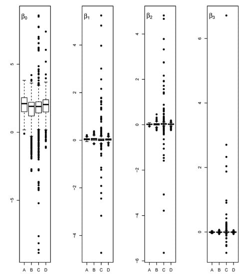 Boxplots of the coefficient estimates , , , and of the NB model for length of stays (); A = ML, B = MD10r, C = MCML10, D = MCML + D.