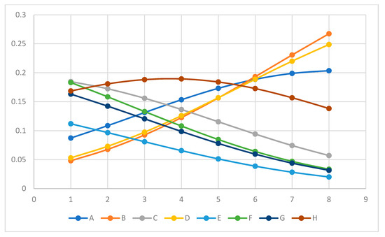 A more detail investigation on the priorities of the flavors depending on the specific of the respondents can be found in profiling by the demographic features. Changing one predictor due to its values from Table 1, while keeping all the others at their mean levels produces the dependence of the priorities by the particular predictor. Figure 2 demonstrates behavior of the preferences by the income predictor. We see a drastic increase from the worst to the best positions for the B and D flavors, some improvement in A position, drop in levels of four other flavors, and a concave behavior of the H flavor with the maximum reached near the level of income about 50–74 K. Although there is no data in Table 1 for the customers with income of 125–149 K, the prediction for those can be made by the estimated priority shares as well. In general, the behavior of the three flavors A, E, and H shown in Figure 2 repeats their profiling in separate consideration presented in Figure 1, so the results of both approaches support each other.