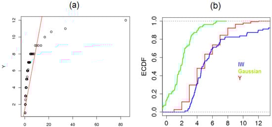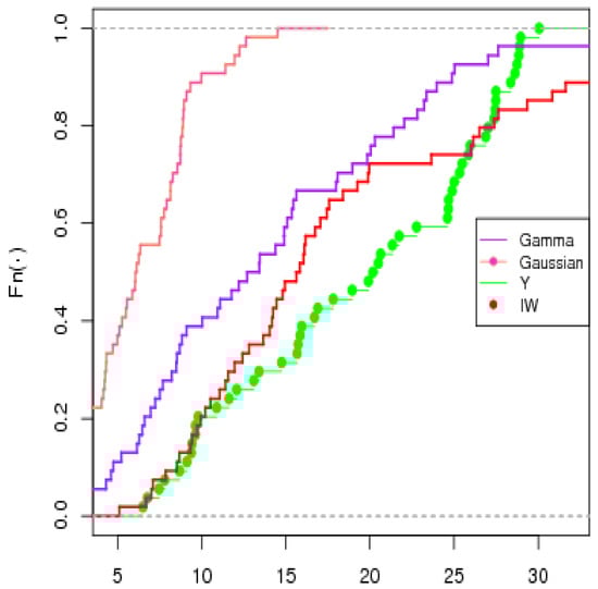 In order to aid in distributional assessment of the response variable Y, the empirical cumulative distribution function (ECDF) plot was proposed. Kolmogorov–Smirnov goodness of fit test (K–S) was calculated based on IW, Gaussian, and gamma distributions. The IW-Reg and IW-BReg models based on log and identity link, and loss functions were fitted using the proved Lemmas in Section 2 and Section 3. Bayes coefficients were obtained using a gamma prior with some known values of the hyperparameters and . In addition, Huber’s function was suggested to avoid such distortions due to an outlier in ; see Appendix A. In this case, under regularity conditions, estimator has asymptotically normal distribution [,]. The performance of all these models were compared. Modeling performance is measured in terms of some criteria, such as AIC, D, D/df, and MSE []. We also used Thiel’s inequality coefficient to compare the prediction accuracy of the selected models [,]. The backward-selection method was used in the IW-BReg model to select the best fit in view of the covariates.