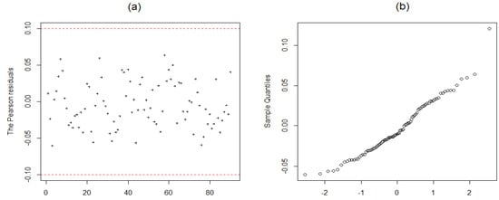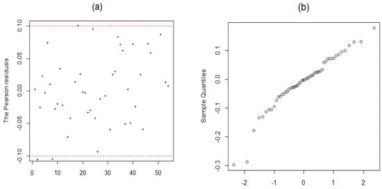 (a) Pearson residuals plot and (b) Normal Q-Q plot of the Pearson residuals for the Model VI based on biweight function as mentioned in Table 6.