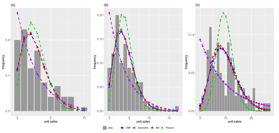 Estimated marginal distributions associated with the trivariate CMP (blue/square), the trivariate geometric (purple/circle), the trivariate negative binomial (red/triangle), and the trivariate Poisson (green/diamond) compared with the original data relative frequencies (histogram) regarding the number of unit sales for: (a) Store 1, (b) Store 2, (c) Store 3.