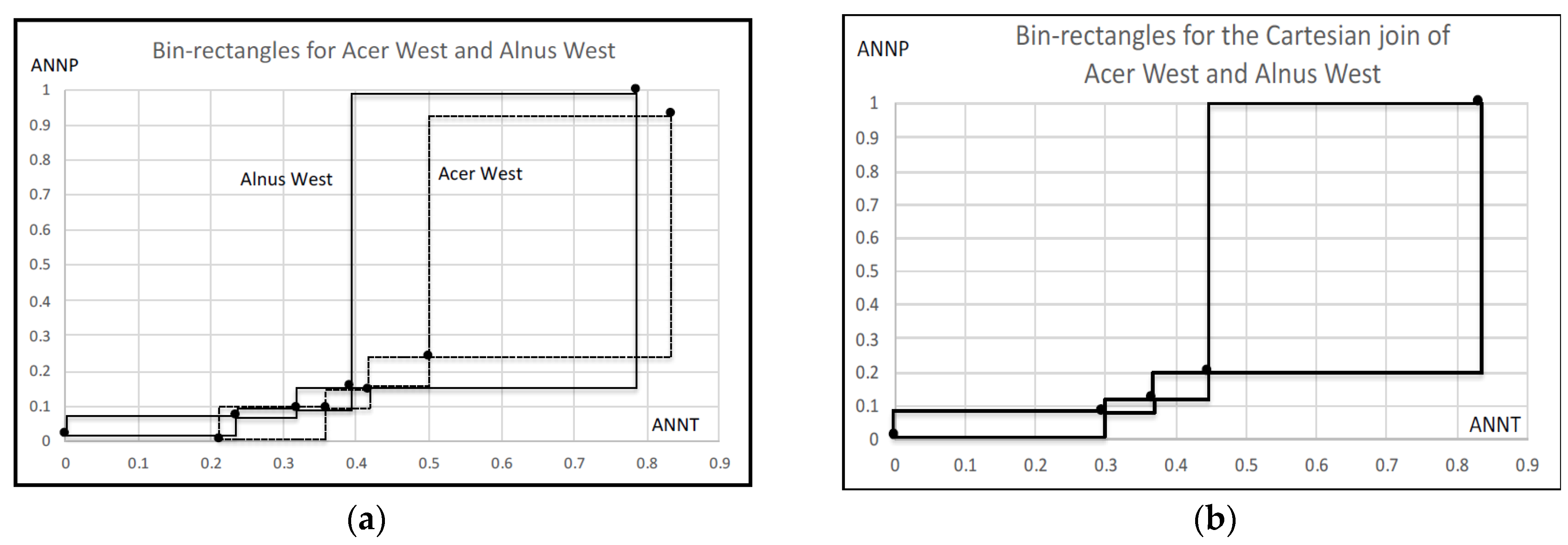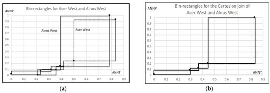 Table 10 shows the average compactness of each feature in each clustering step. As clarified by bold format numbers, the most informative feature is ANNP then JULP. Figure 18a shows the nesting structure of rectangles spanned by ten hardwoods with respect to the minimum and the maximum values of ANNP. Another representation of the structure is: