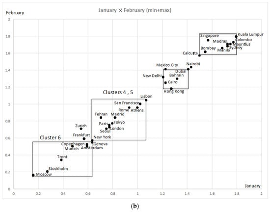 Table 7 shows the average values of the compactness for 12 months at selected clustering steps: 25, 29, 31, 33, and 35. As clarified by bold format numbers, the most informative features are February, then January and May. The feature May is important to recognize Cluster 1, 2, and 3. The scatter diagram of Figure 15a shows this fact explicitly, where we used the sum of the minimum and the maximum temperatures as feature values. Figure 15b is the scatter diagram for January and February. This figure describes well the mutual relations of Cluster 4, 5, and 6, while the distinctions between Cluster 1, 2, and 3 disappear. We should note that we can reproduce essential structures appearing in the dendrogram by using only three selected informative features.