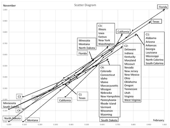 Table 11 is the average compactness for each feature in selected clustering steps. As clarified by bold format numbers, February and November are the most robustly informative features. Figure 21 is the scatter diagram of 48 states and is similar to the PCA result in Figure 19. All line graphs exist in a narrow region from “cold” to “warm” with respect to February and November. Many states share the minimum and/or the maximum quantile vectors. For example, Alabama, Georgia, and Louisiana share the maximum quantile vector as noted in box C, and the minimum quantile vector as box J, etc. The value of compactness is directly linked to the span of the minimum and the maximum quantile vectors under the assumption of equal bin probabilities. As a result, we have the dendrogram of Figure 22.