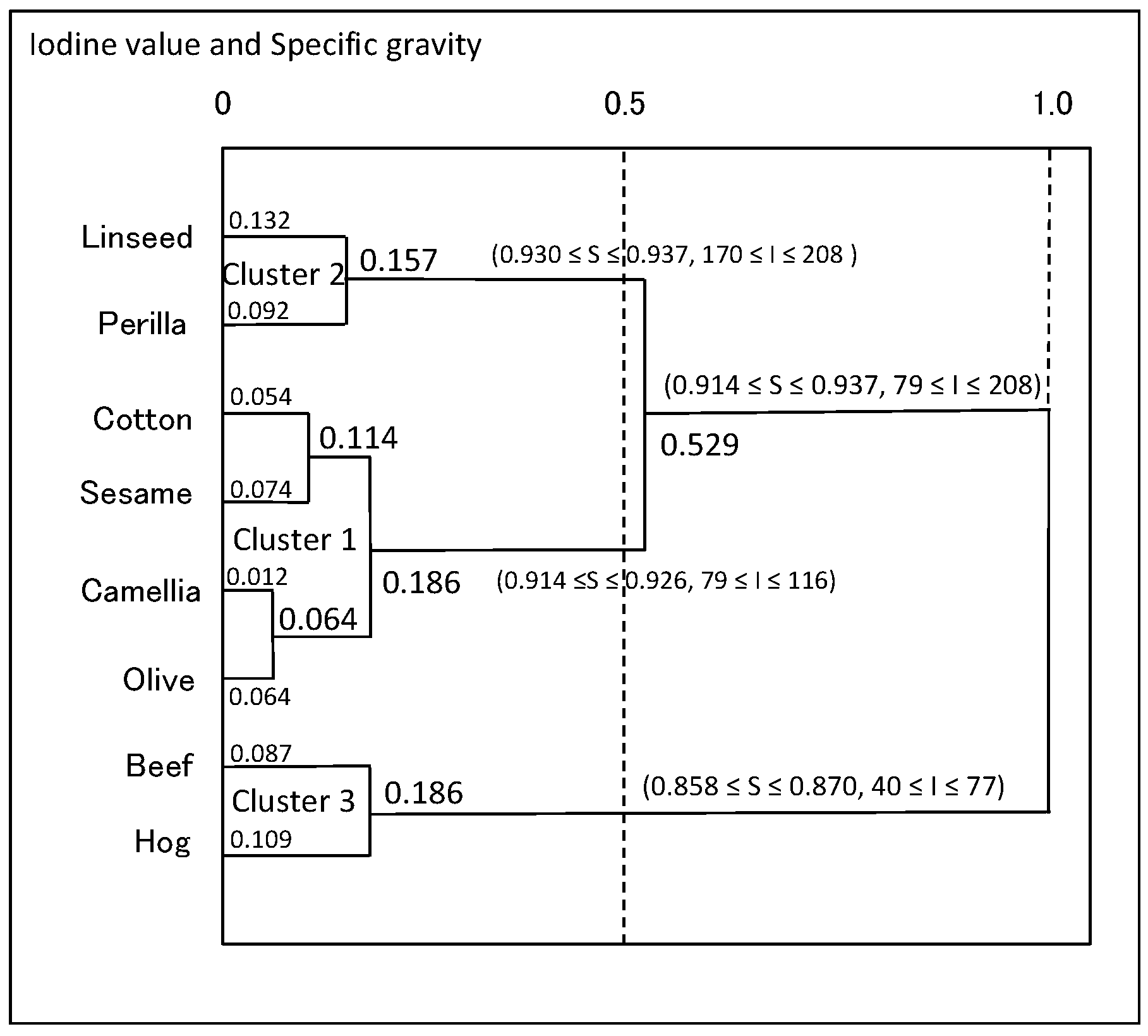 Figure 11 is the scatter diagram of the oils data for the selected two robustly informative features. This figure shows again three distinct clusters (linseed, perilla) and (cotton, sesame, camellia, olive), and (beef, hog). They exist in locally limited regions and they organize again a geometrically thin structure with respect to the selected features. Figure 12 shows the dendrogram with concept descriptions of clusters with respect to Specific gravity and Iodine value. This dendrogram clarifies two major clusters, Plant oils and Fats, addition to three distinct clusters, and the compactness takes smaller values compared to the dendrogram in Figure 10.