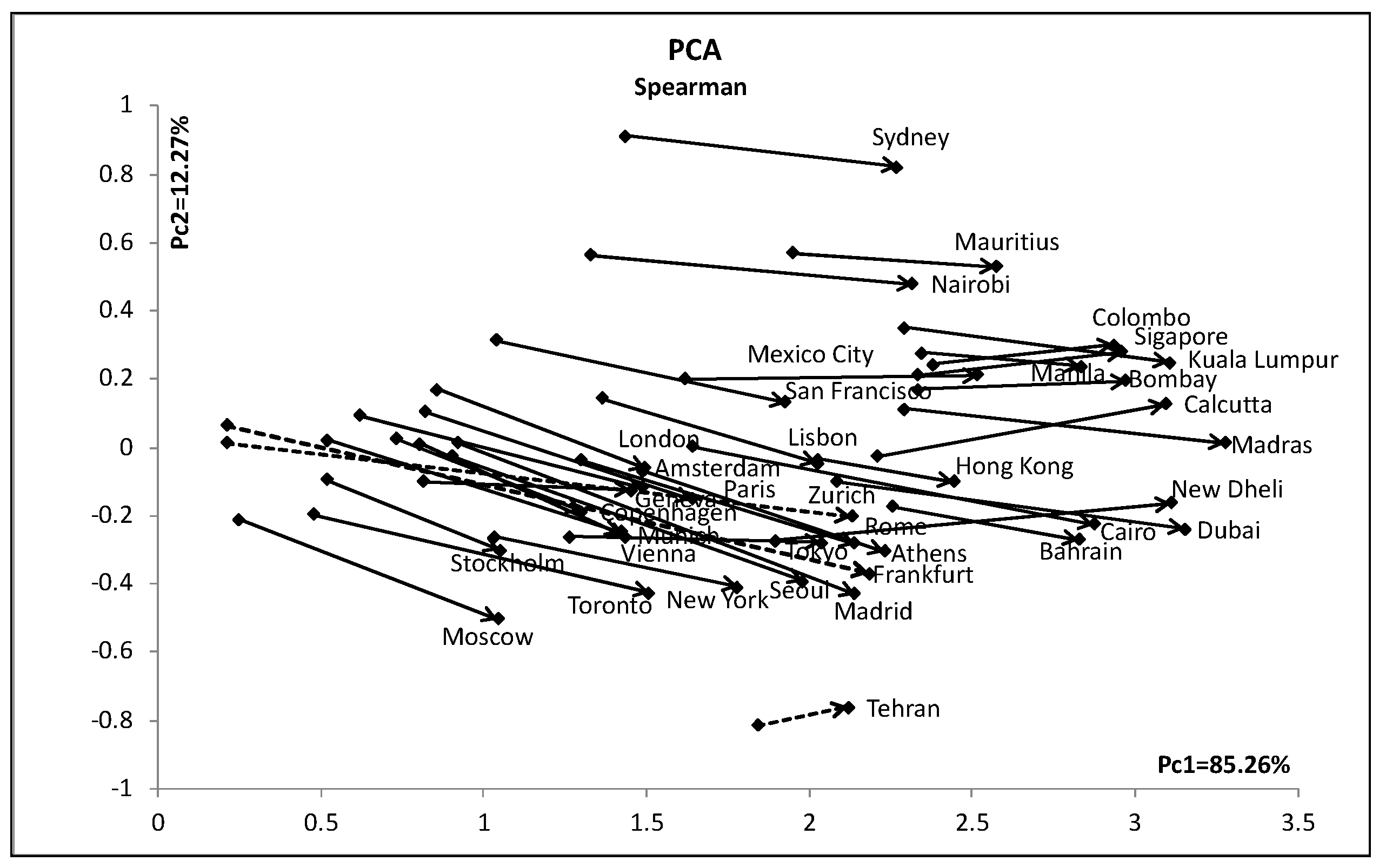 De Carvalho and De Souza [] used this temperature data in their dynamical clustering methods. In this data, 12 interval-valued features describe 37 selected cities. The minimum and the maximum temperatures in degree centigrade determine the interval value for each month. We use 0−1 normalized temperatures for each month, and we obtained the PCA result in Figure 13. In this figure, each arrow line connects from the minimum to the maximum quantile vectors and its length shows the concept size. The first principal component has a large contribution ratio and 37 cities line up from cold (left) to hot (right) in the limited zone between Tehran and Sydney. In this data, we should note that Frankfurt and Zurich have very large concept sizes while Tehran has a very small size compared to other cities.
