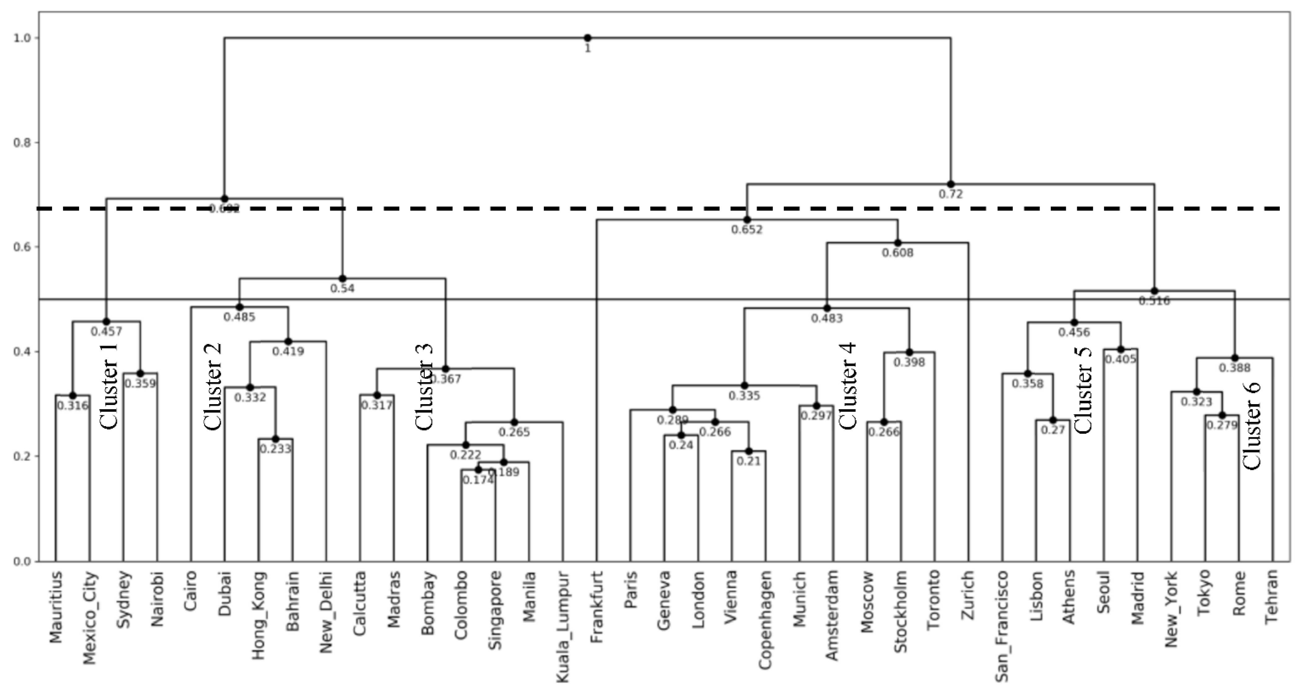 In Figure 14, we can recognize 6 clusters at cut-point 0.5 except Frankfurt and Zurich. De Carvalho and De Souza [] obtained four clusters using their dynamical clustering methods. We can find exactly the same clusters by cutting our dendrogram as the dotted line in the figure.