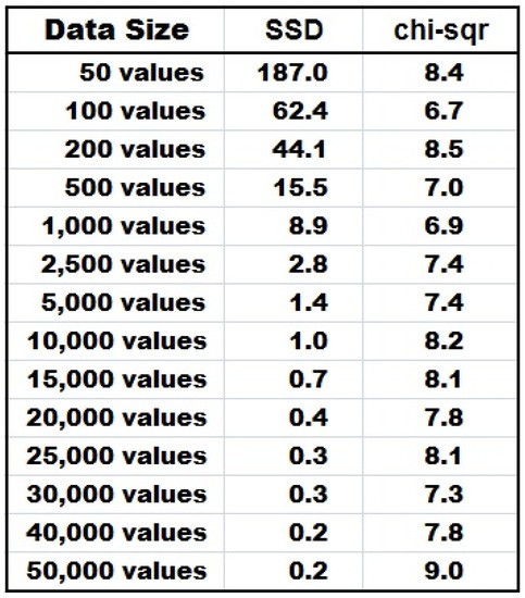 In total, we use 14 distinct values for N, from the lowest value of 50, to the highest value of 50,000. For each N we perform a scheme and obtain its SSD average and chi-square average.