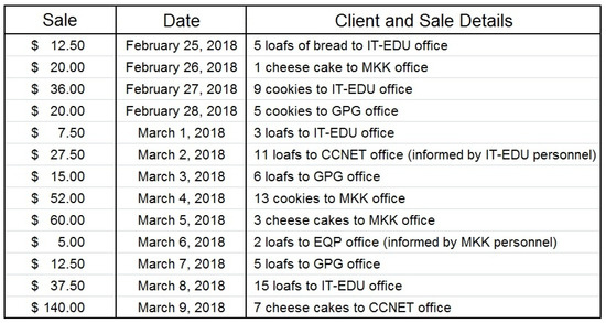 The table shown in Figure 31 depicts several hypothetical sale amounts at a small bakery, selling bread loafs, cheese cakes, and cookies. Clearly, a large sale of 5 bread loafs for the office of IT-EDU company would imply that no additional such sales would occur during the rest of the day as everybody there is already full and that nobody will be hungry anymore soon, thus demand there for bread is zero. In addition, knowledge about the high quality of the delicious products baked there is spread via rumors especially after one successful sale in one office, and then leads to another sale in another office, such as the sale of 11 bread loafs at CCNET office after employees there were informed by IT-EDU personnel about the high quality of the baked items for sale.