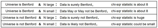 If the Benford status of the parental universe is still unknown to the researcher, then the chi-square statistic should be very high—if parental universe is non-Benford and data size N is large, or it should be much lower near 8—if parental universe is Benford, or it should be somewhere in between approximately—if parental universe is only partially Benford and data size N is not too small. Hence, in this case, it should be acknowledged that the focus and conclusion of the chi-square test is all about the reasonableness of the entire random selection process and the Benford status of the parental universe of numbers, and not solely about the data set on hand! The research question of the chi-square test here is actually stated as follows: “Is the parental universe of numbers truly Benford and the selection process probable?” Or alternatively: “Is the probability of obtaining the digital structure of our data set with its associated size N reasonable enough, given that the parental universe of numbers is truly Benford?” The focus is not about the closeness of the digital structure of our data to the Benford’s structure, nor about its size N, but rather whether the probability of obtaining our sample from the parental population of numbers was fairly reasonable and not too rare—assuming that the parental universe of numbers is truly Benford. Rareness, such as when the chi-square test yields p value less than 1% simply implies that our assumption about the parental universe of numbers being Benford was incorrect. Arithmetically, this p value (the chi-square statistic in essence) is obtained via the combination (the confluence) of the deviation of our data from Benford as well as the sample size N. Yet, the chi-square test says nothing uniquely about the digital structure of our sample on hand (without considering its size in this context). The chi-square test is simply not interested in examining exclusively the closeness of our data to the Benford configuration, but rather whether or not sampling was not too rare probabilistic-wise under the assumption that the parental universe is Benford.
