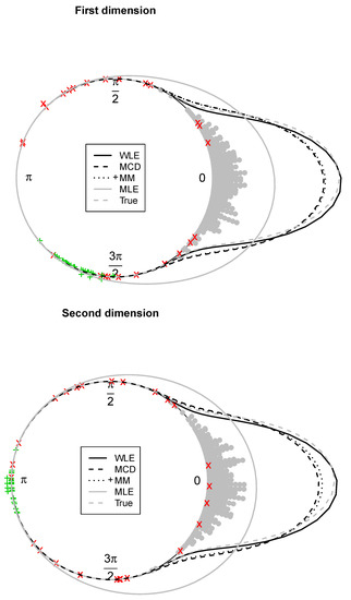A crucial issue in the development of EM and CEM algorithms is the choice of initial parameters values . Moreover, to avoid dependence of the algorithm on the starting point and also to avoid being trapped in local or spurious solutions, it is suggested to run the algorithm from different initial values and then choose the solution that better satisfies some criterion. Here, starting values are obtained by subsampling. The mean vector is initialized with the circular sample mean. Initial diagonal elements of are given by , where is the sample mean resultant length; the off-diagonal elements of are given by (), where is the circular correlation coefficient, and [18]. The subsample size is expected to be as small as possible in order to increase the probability to get an outlier free initial subset but large enough to guarantee estimation of the unknown parameters. Several strategies may be adopted to select the best solution at convergence, depending on the robust methodology applied to update the parameters values. For instance, after MM-estimation, one could consider the solution leading to the smallest robust scale estimate among squared distances; when applying impartial trimming, one could consider the solution with the lowest determinant ; the solution stemming from weighted likelihood estimating equations can be selected according to a minimum disparity criterion [32,33]; or minimizing the probability to observe a small Pearson residual over multivariate normal data ([9,32] and references therein).