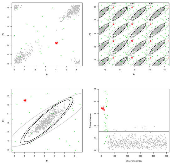 The data have been generated according to the procedure described in [8]: For a fixed condition number , we obtained a random correlation matrix R. Then, R has been converted into the covariance matrix , with , , and denotes a p-dimensional vector of ones. Then, 25 outliers (red cross) have been added in the direction of the smallest eigenvalue of the covariance matrix [9], whereas the remaining 25 outliers have been sampled from a uniform distribution on (green plus).