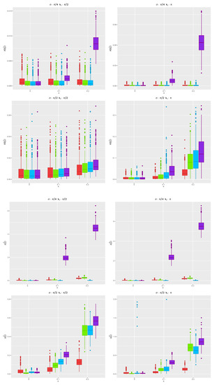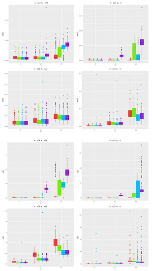 Here, we display the results for the scenario with . Figure 5 shows the boxplots for the angle separation and divergence computed using the MCD (red), MM (green), WLE (blue), and MLE (violet) for all the replicates when , while the case is given in Figure 6. Under the true model, the robust CEM gives results close to those stemming from the MLE. In contrast, in the presence of contamination in the data, the proposed robust CEM algorithm achieves a completely satisfactory accuracy, while the MLE deteriorates, especially when the contamination level increases. When , the MCD shows the best performance among the robust proposals for the more challenging cases with , when outliers are not well separated from the bulk of genuine data points. The same is not true for : The presence of outliers over all the p dimensions needs a different tuning of robust estimators.