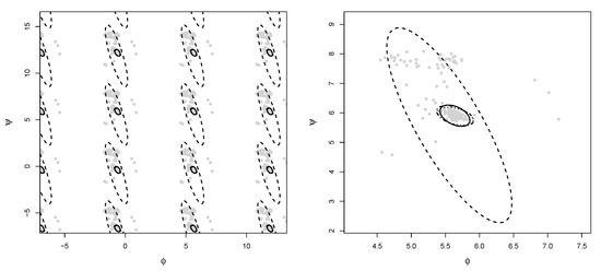 The multivariate wrapped normal distribution is obtained by component-wise wrapping a p-variate normal distribution on a dimensional torus [16,17,18] according to , . Formally, is multivariate wrapped normal and the modulus operator is performed component-wise. Then, we can write .