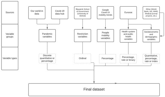 The methodology was illustrated on a rather complex dataset, produced by the authors, related to the spread of the COVID-19 pandemic in the 27 EU 27 Member States, covering the period from the first day when collected COVID-19 data were published to the last month before the start of vaccination programs in Europe. Data sources were general data repositories for COVID-19 data [13,14], data repositories of research projects on COVID-19 [15,16] and institutional repositories (Eurostat, United Nations, World Health Organisation, the World Bank).