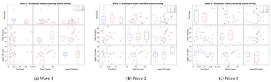 Exploratory step: Multiple scatter-plots for PercConf, 2019_Risk_Poverty and aged_70_older) colored by school_closing.