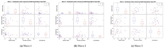 Figure 3 shows scatter-plots and box-plots for deaths_daily, female_smokers and workplaces_mobility, colored by Health_Expenditure_Type (1 = ‘mainly public’, 0 = ‘mainly private’) in all the waves considered. It can be observed, for example, that in wave 1 three countries (of which two have mainly a private health system) were outliers with respect to the number of deaths per 1000 inhabitants. In wave 2 only one country (with public health system) was an outlier with respect to deaths_daily, whereas in wave 3 there were no outliers. These can be seen by looking at the conditional box-plots. Another finding is that in wave 3 the first quartile of deaths_daily for countries with private health system equals the third quartile of this variable for countries with public health system, indicating that the number of deaths per 1000 inhabitants was much greater in those countries with a mainly private health system. This in an important example about using this visual tool to immediately check the impact of EU countries’ policies with respect to some macro-features of the countries, like the type of health system, in this case. There has been a long and controversial debate on the effectiveness of private or public health system to tackling the pandemic. The neoliberalism in healthcare has been the prevalent trend in almost all Western EU countries in recent decades, but the COVID-19 pandemic has re-ignited some recent literature in favor of the public system [20].