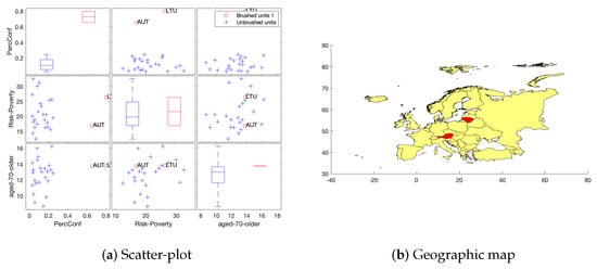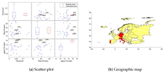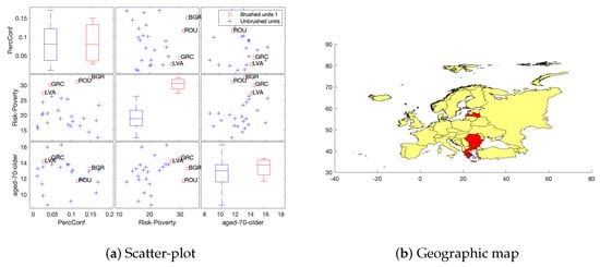 - Spatial data tool. In multiple scatter-plots the user can select which data points wants to be highlight in a geographical map. The code allows the possibility to link the data to a shape-file (when available), inspired by the GeoDa user friendly tool for spatial data analysis (https://geodacenter.github.io, accessed on 1 February 2021).