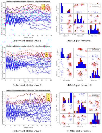 The Forward-plots monitor the trajectories of the units in order to illustrate their performance along the steps of the FS-DB algorithm. In the first step of the algorithm the subset of closest units is identified (according to a proximity function based on distance ). In the subsequent steps, units are added one-by-one to this subset until there are no more units to add. In each iteration, units are allowed to enter and exit the subset, since in each iteration the current subset is formed by those units with lowest distance measure. Thus, the Forward-plots are useful to understand how the metric unfolds rather than providing only a final picture of the outcome, like the final MDS-plot. For example, trajectories which end close to one another represent units which are similar among themselves, but different from others. Moreover, those units that enter in the final steps of the algorithm can be seen as multivariate outliers according to the monitored distance.