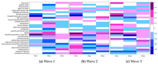 For wave 2, a similar pattern of correlation can be observed for PC1, with Health_Expenditure_Type having the highest positive correlation and hospital_beds the highest negative one. Regarding PC2, there is a less clear correlation pattern, since all variables are weakly or moderately correlated with PC2. For PC3 Health_Expenditure_Type and life_expectancy were highly positively correlated, whereas school_closing and transport_closing showed high negative correlations with PC3.